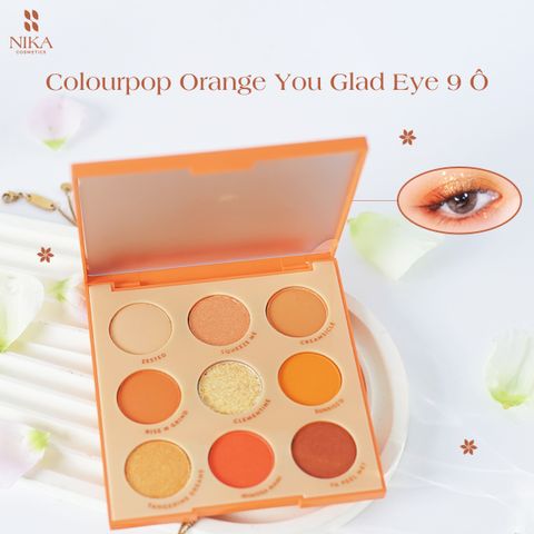 - Bảng Mắt ColourPop Orange You Glad Eye Palette với 6 màu lì, 2 màu nhũ và 1 màu nhũ lớn hay còn gọi là glitter. Bảng mắt mới với tông cam ngọt ngào dành cho các nàng thích makeup nhẹ nhàng , “sương sương” kiểu vintage dạo phố.