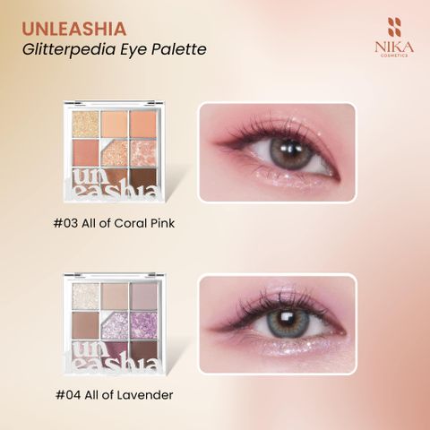 - Bảng Phấn Mắt 9 Ô Unleashia Glitterpedia Eye Palette được đánh giá cao khi là bảng màu thuần chay khi không chất phấn không có chứa sulfat, các chất độc hại, gluten hoặc phthalates. Chất phấn có chứa nhiều hạt, màu sắc và được thiết kế đậm nhạt theo từng tông màu, phù hợp với nhiều phong cách trang điểm khác nhau; có độ bền cao, hỗ trợ tạo độ bóng, độ lấp lánh nổi bật cho đôi mắt.
