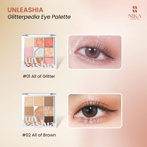 - Với thiết kế hộp Bảng Phấn Mắt 9 Ô Unleashia Glitterpedia Eye Palette nhỏ gọn, xinh xắn, các chị em hoàn toàn có thể mang theo mọi lúc, mọi nơi. Dòng phấn mắt này sở hữu 9 ô màu khác nhau, với các tone màu đa dạng, sở hữu kết cấu phấn: phấn dạng nhũ lấp lánh, phấn dạng kem và loại phấn dạng bóng ngọc trai lấp lánh.