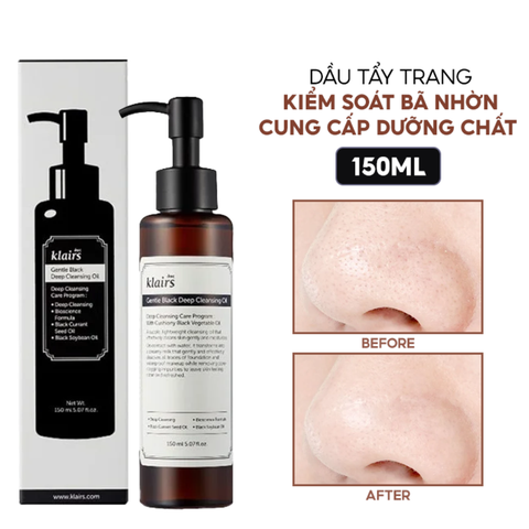 Dầu Tẩy Trang Kiểm Soát Bã Nhờn, Cung Cấp Dưỡng Chất Cho Da Klairs Gentle Black Deep Cleansing Oil là tẩy trang dạng dầu được điều chế từ các tinh dầu khác nhau như dầu mè đen, dầu hạt nho đen,... giúp nhẹ nhàng làm sạch bụi bẩn, lớp trang điểm, sợi bã nhờn trong lỗ chân lông mà vẫn duy trì độ ẩm cho da hiệu quả thuộc thương hiệu Klairs đến từ Hàn Quốc.