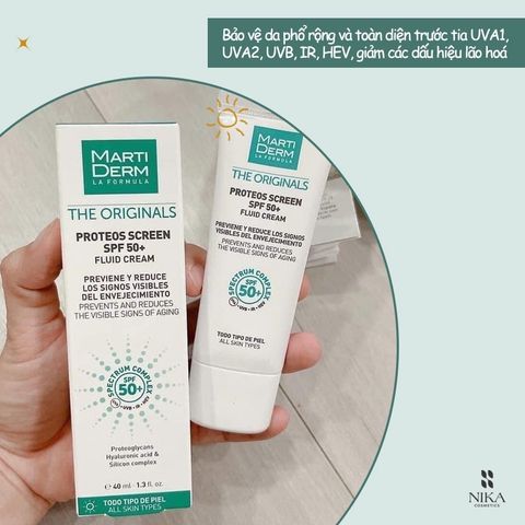 Kem chống nắng MartiDerm The Originals Proteos Screen SPF50+ Fluid Cream giúp ngăn ngừa và sửa chữa các dấu hiệu lão hoá da sớm, giữ cho làn da trẻ trung, tươi tắn và đều màu.
