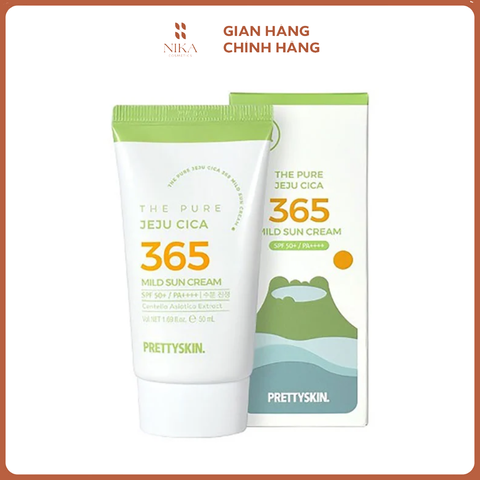 Kem chống nắng PrettySkin The Pure Jeju Cica 365 Mild Sun Cream SPF 50+ PA++++ là sản phẩm kem vật lý nâng tone nhẹ nhàng, bảo vệ da phổ rộng trước tia UVB/UVA và ánh sáng xanh với chỉ số SPF 50+ PA++++; đồng thời chứa chiết xuất rau má Jeju làm dịu da, niacinamide hỗ trợ làm sáng và se khít lỗ chân lông, collagen thủy phân cung cấp độ ẩm và cải thiện đàn hồi da, giúp làn da khỏe mạnh, mịn màng và dịu nhẹ, phù hợp cả da nhạy cảm, da mụn hoặc da khô