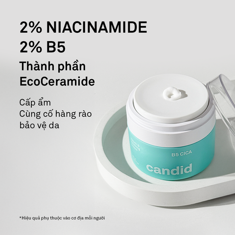 Kem Dưỡng Candid B5 Cica Repair & Soothing Cream là kem dưỡng ẩm phục hồi da chuyên sâu, chứa bộ 3 hoạt chất Vitamin B5, Niacinamide và 5-Cica giúp làm dịu, tái tạo tế bào da và củng cố hàng rào bảo vệ da. Công thức được tăng cường với thành phần độc quyền Eco-Ceramide 100% chiết xuất từ nấm men thực vật, mô phỏng Ceramide tự nhiên, giúp duy trì độ ẩm lâu dài lên đến 72 giờ.