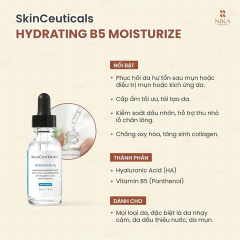 Tinh chất dưỡng ẩm phục hồi da Skinceuticals Hydrating B5 chứa 4 thành phần (minimal ingredients) có lợi cho da như là Hyluronic acid, B5, không chứa các thành phần có khả năng gây kích ứng cho da như hương liệu. Sản phẩm giúp dưỡng ẩm cho các làn da khô hoặc làn da đang bị kích ứng, giúp làn da bạn phục hồi nhanh chóng. Cực kỳ phù hợp với các làn da nhạy cảm